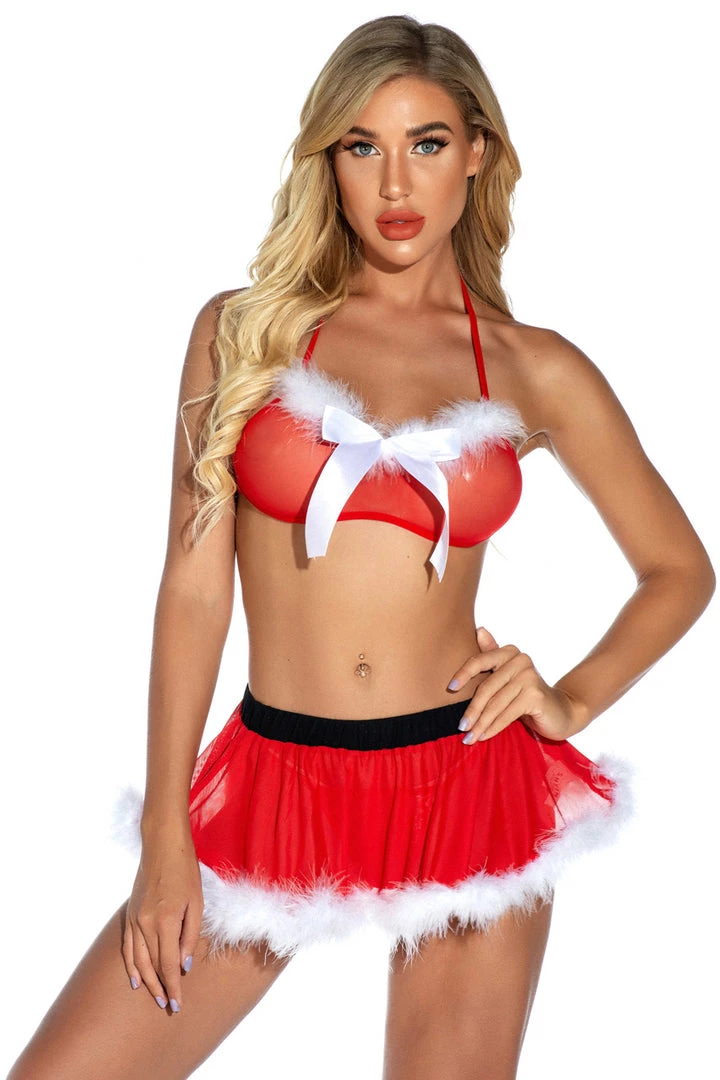 This Christmas cutie set includes a red mesh bra top with marabou trim, an oversized white satin bow, halter straps, a matching mesh skirt with marabou trim, a black band, and thong.