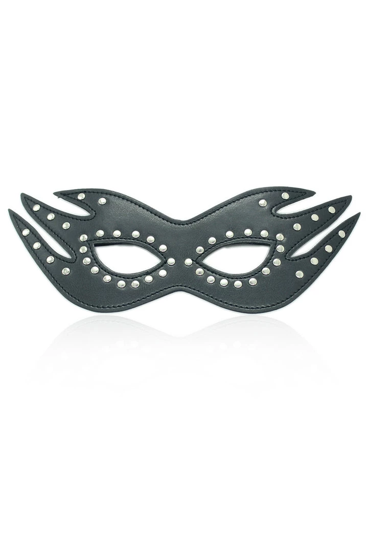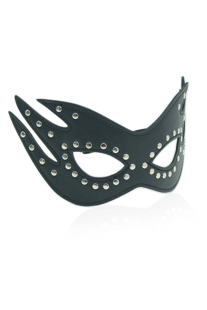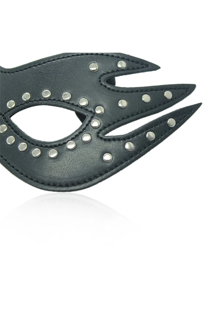 Surprise them with this black, faux leather eye mask with cat eye detail and studded trim.