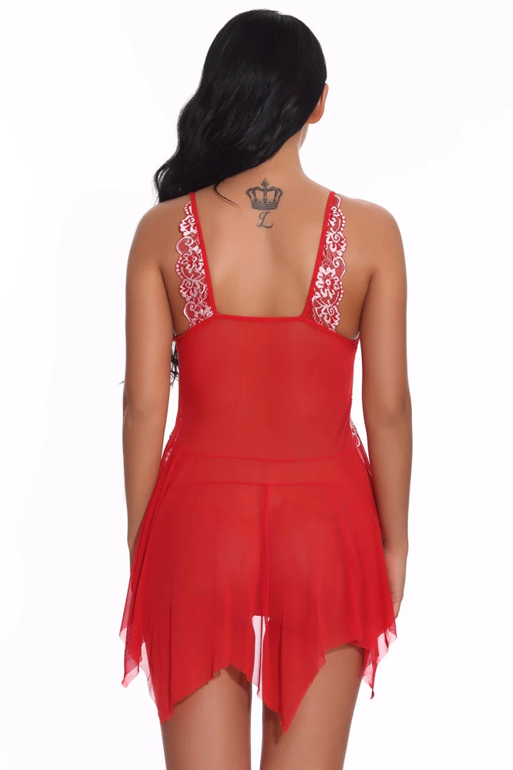 Wow them in this romantic mesh babydoll with contrast metallic lace trim cups, a low cut bust, mini keyhole cut out front, Handkerchief hemline, adjustable straps, and matching panty.