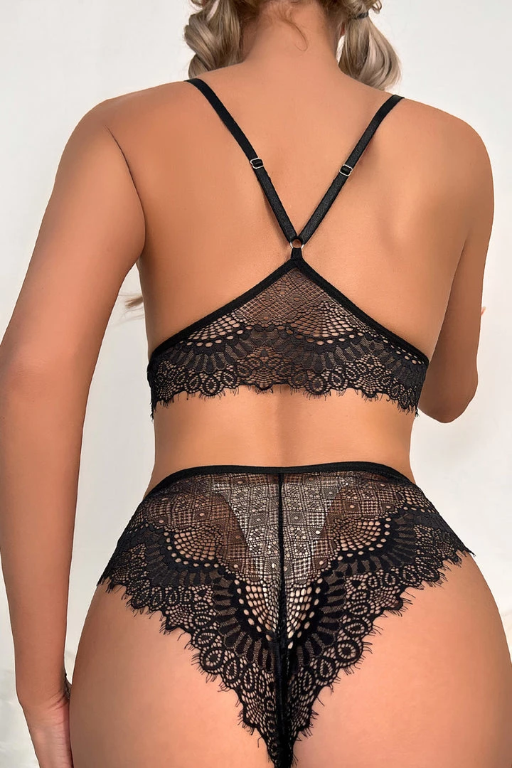 This midnight surprise bra set includes a patterned lace bralette with a large lace underbust detail, scalloped lace trim, and a matching high waisted panty with a keyhole cut out front and mesh details.