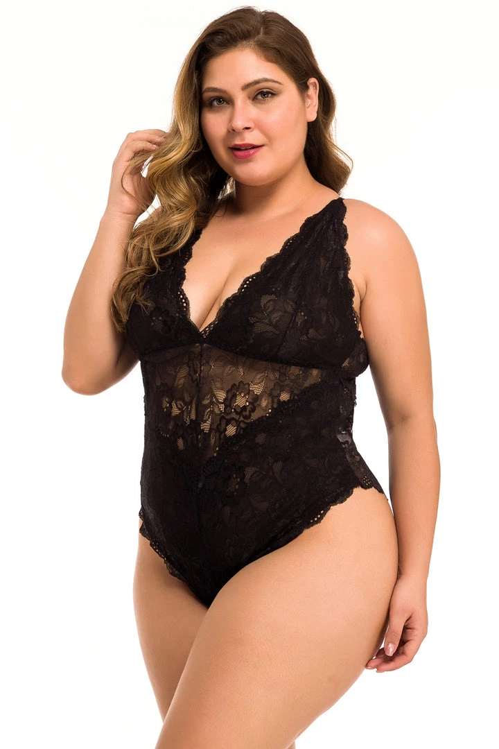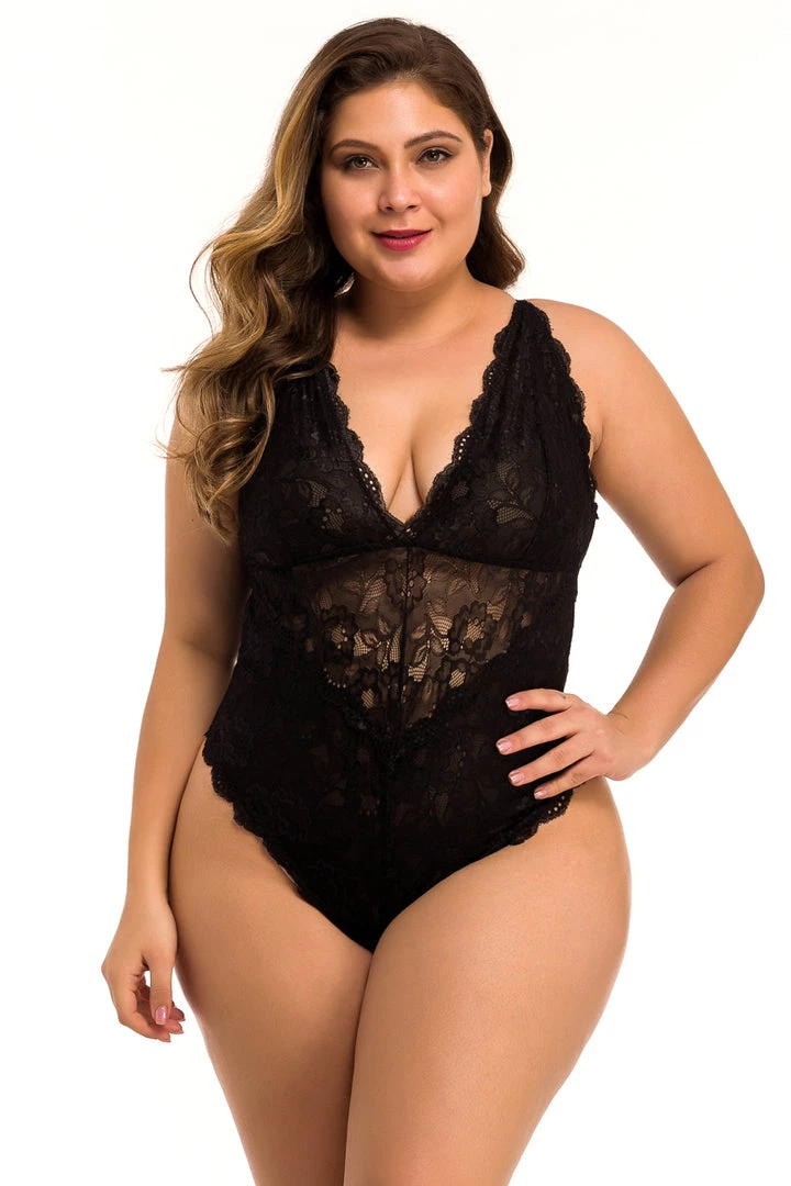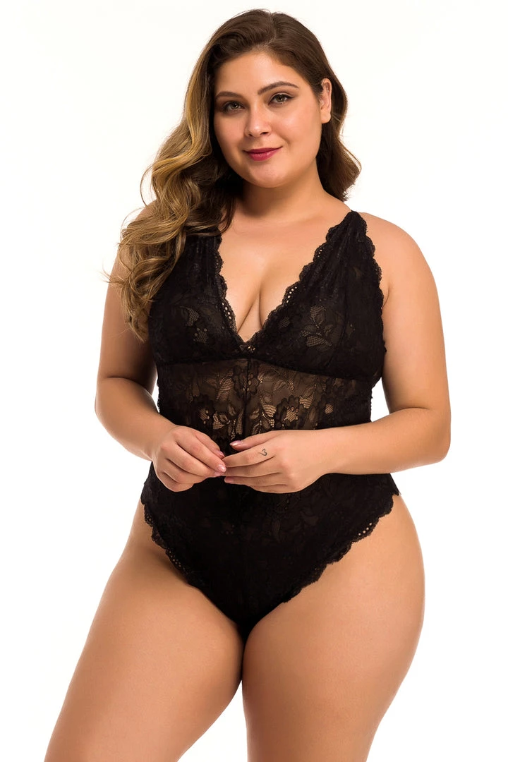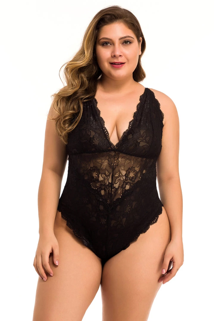 This plus size, lucky in lace teddy features a delicate floral lace pattern, scalloped trim, a V cut neckline, and high cut hips.