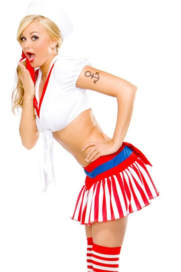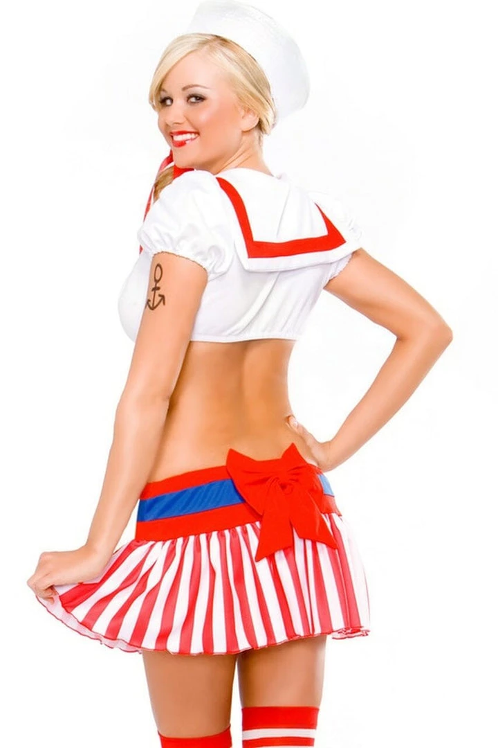 3 Piece Sexy Sailor Costume includes Tie Front Top with Collar, Skirt, and Hat. Shown with #L6005 Candy Cane Stockings not included.Â