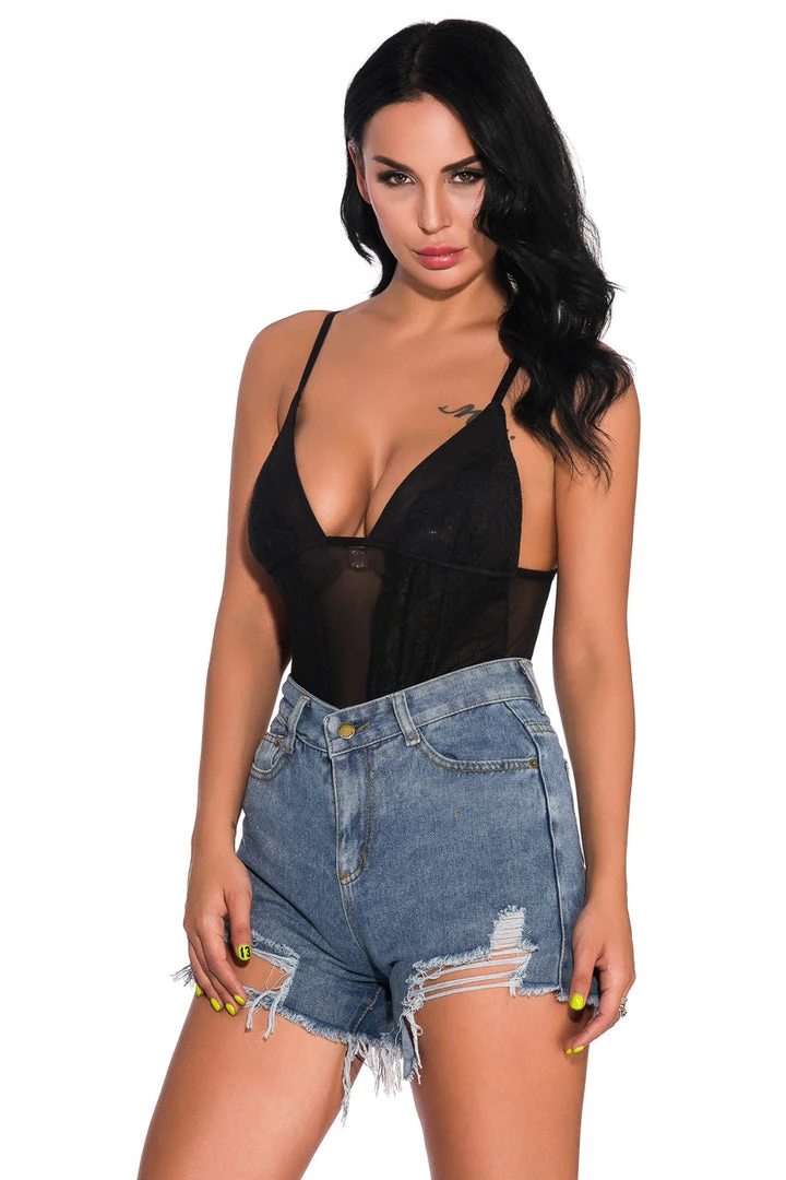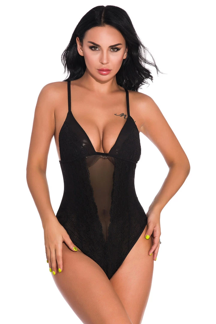 This eye-catching teddy features a unique, geometric print mesh bodice, a see through mesh inset, a low cut bust, and a cheeky cut back.