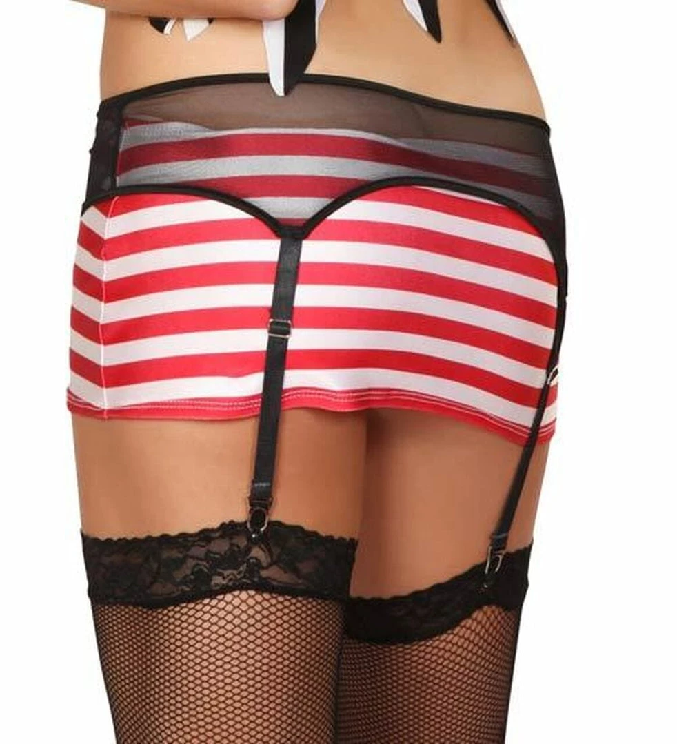 Four Piece Pirate Sexy Costume includes Halter Tattered Style Crop Top with Lace-up Front, Pull on Mini Skirt, Adjustable Garter Belt, and Bandana. Made in USA Shown with #L9027 Fishnet Stockings and Pirate Cutlass not included.