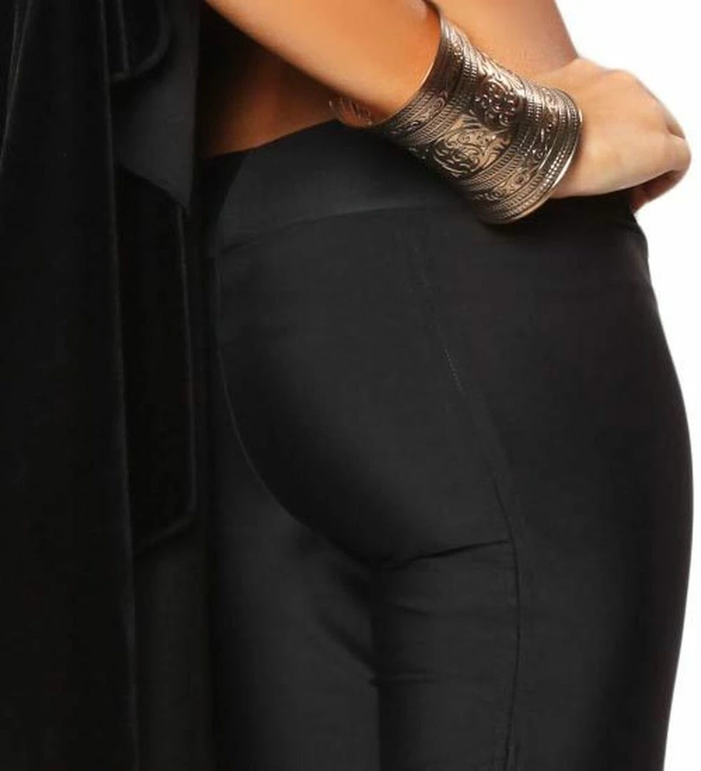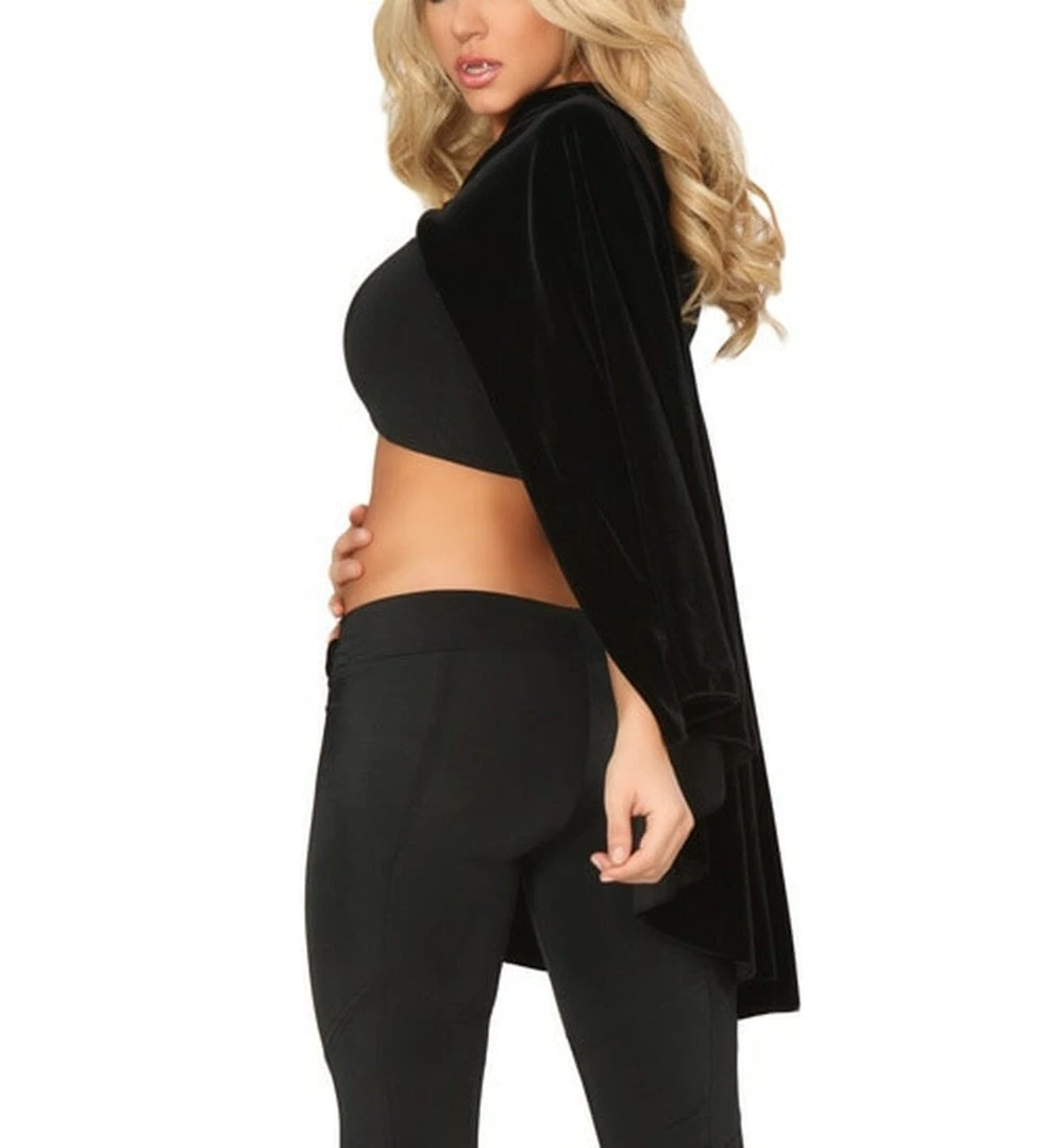 Vamp Attack Costume includes Microfiber Tube Top with Contrast Gold Eyelets and Lace-up Detail, Slinky Microfiber Cropped Pants with Attached Belt featuring Gold Metal Bat Buckle, and Sexy Stretch Velvet Off-the Shoulder Cape