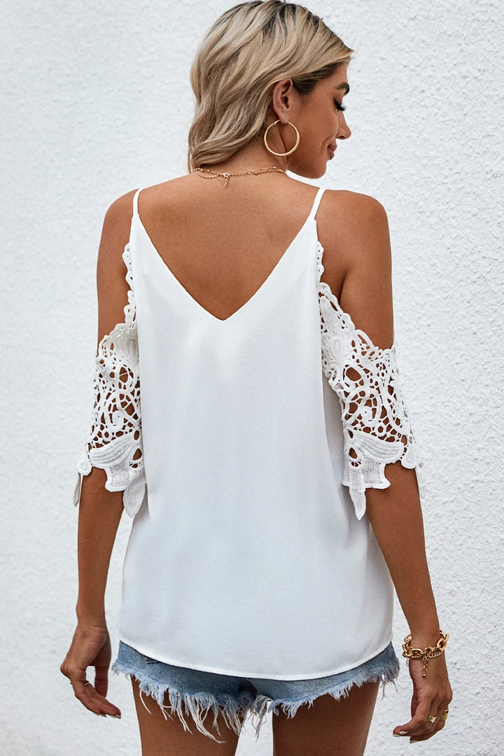 Show a little sass with this white top with cold shoulder cut outs and lace sleeves.