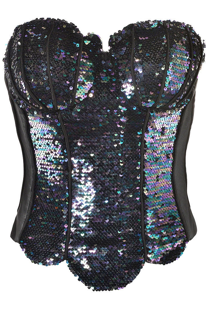 Every mermaid needs a touch of glitter, so complete your DIY mermaid costume with this Black Sequin Sea Siren Corset!  This polyester and spandex corset features iridescent black sequins and black lining to give off a shell-like look. The corset also features black side panels and clear attached straps to give it a strapless look. Pair this mermaid corset with any of our other mermaid accessories to complete your look!