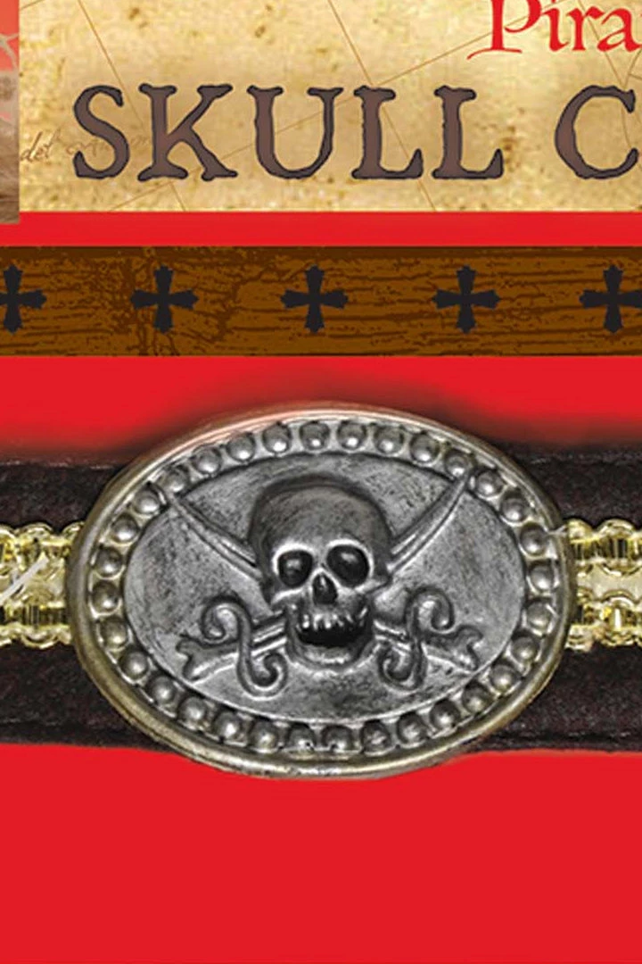 Bring your pirate costume to a new level with this Skull Choker that features a brown faux leather choker with gold trim features a metal-look skull-and-crossbones buckle in the center.