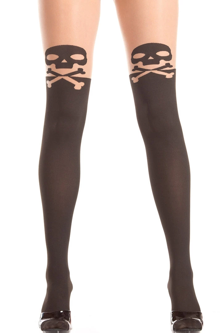 Bad to the bone, these sheer black pantyhose feature a skull and crossbones print.