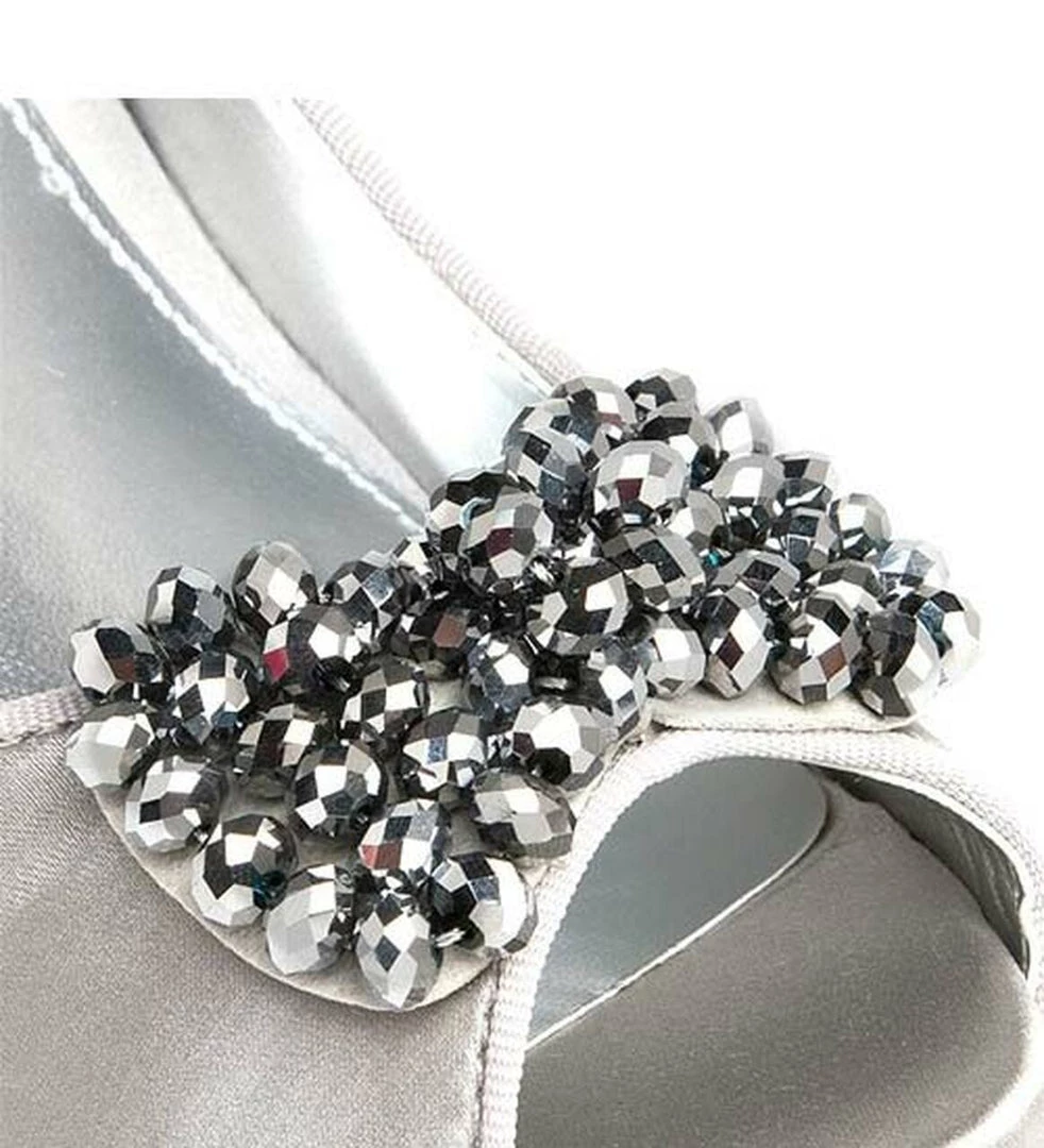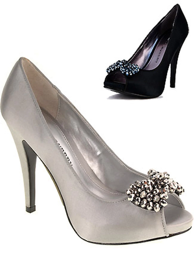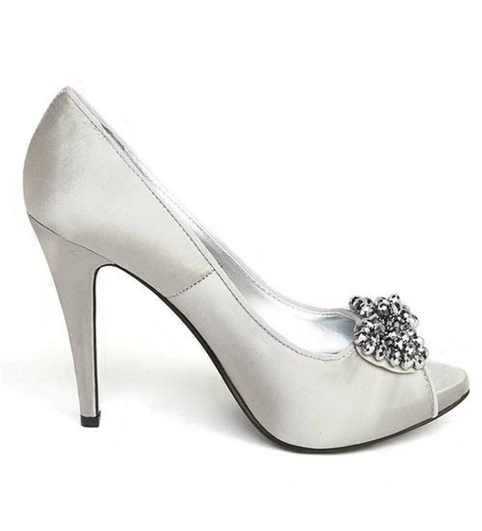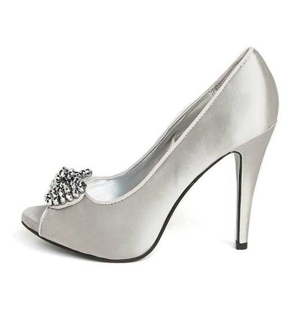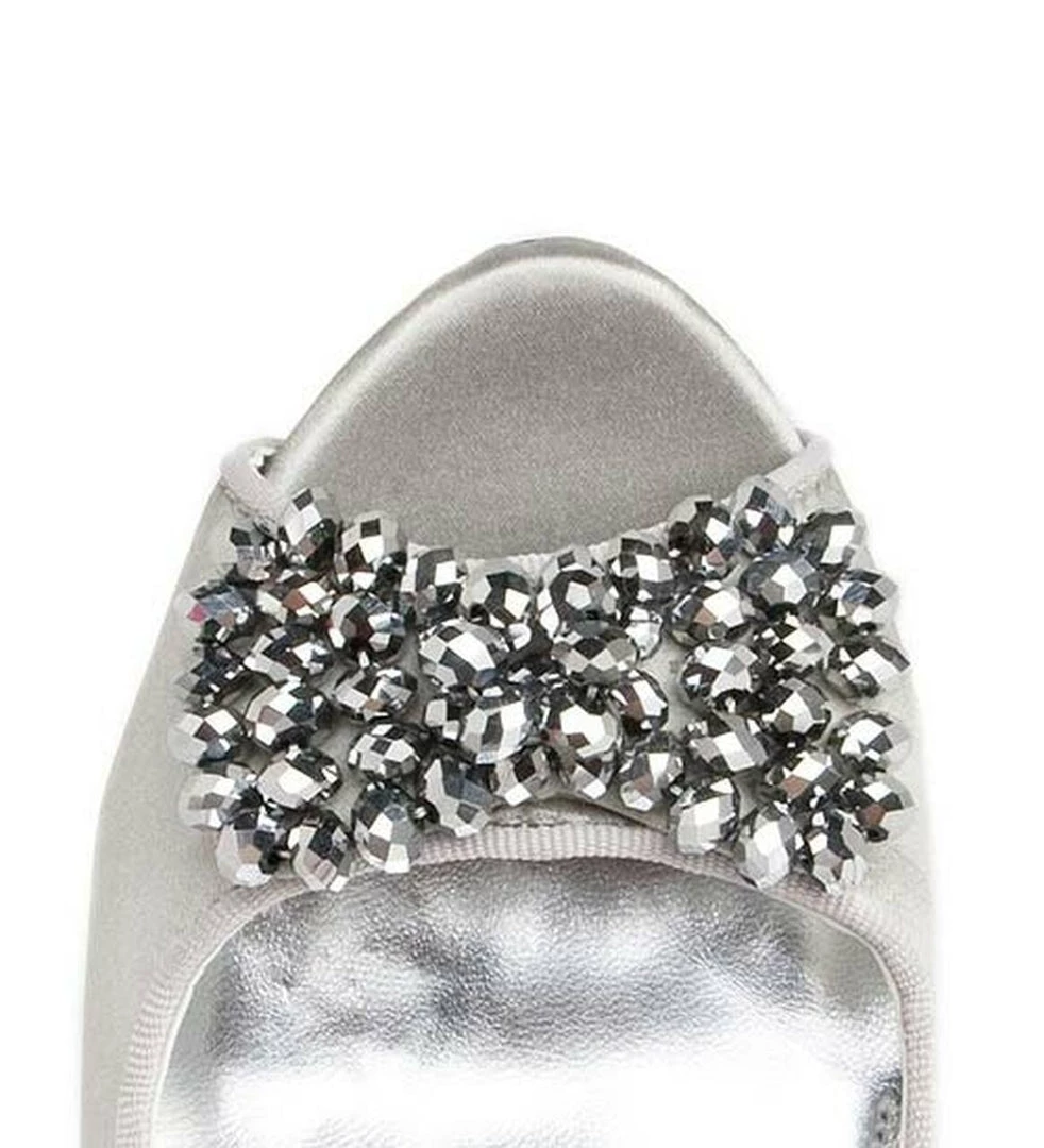 4 ½” High Heel Peep-toe Pump Wrapped in Silver Satin featuring Front Bow Encrusted with Faceted Beads.Â