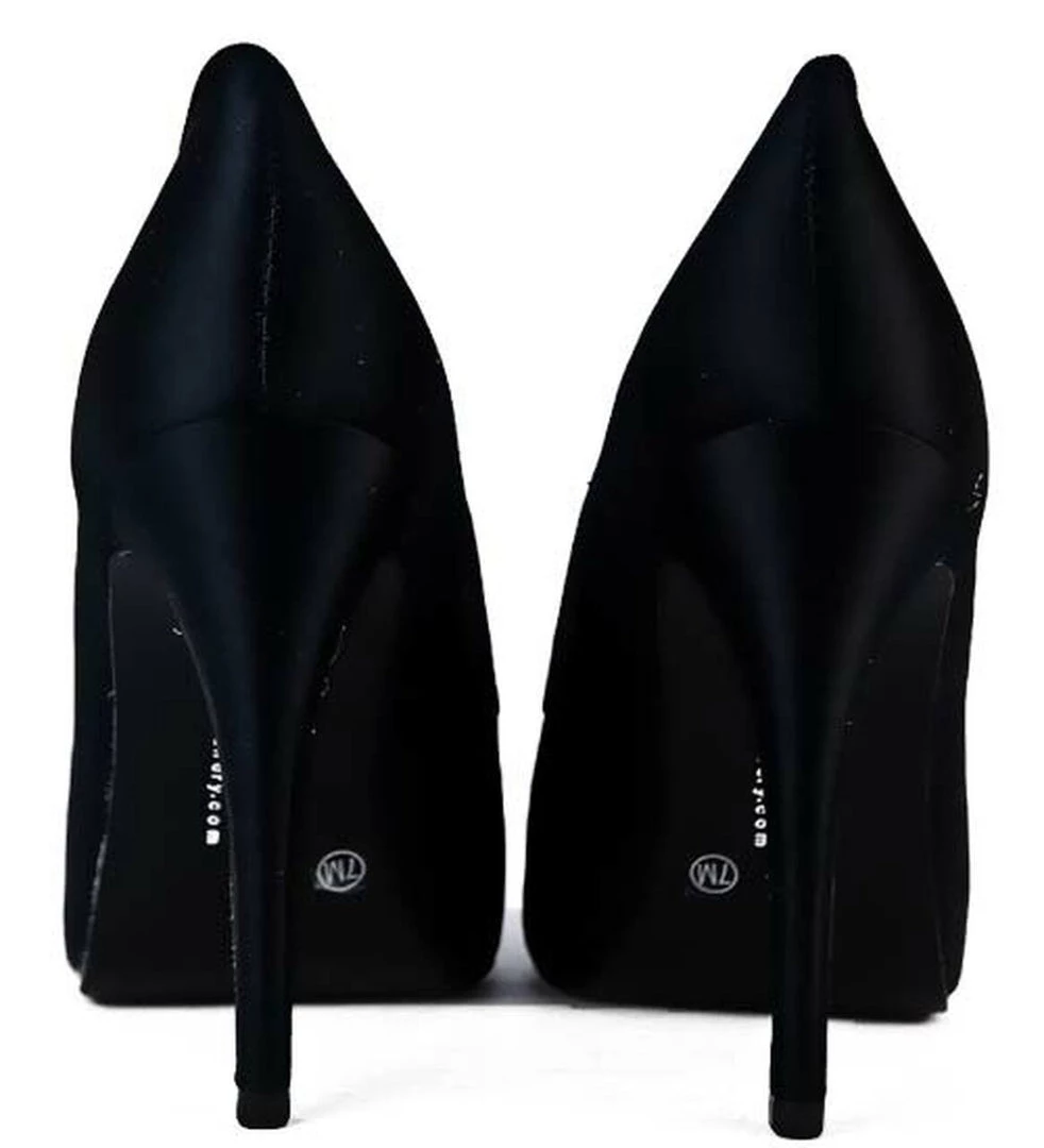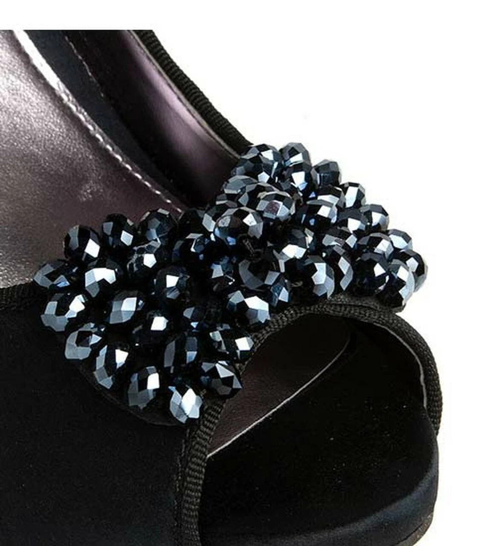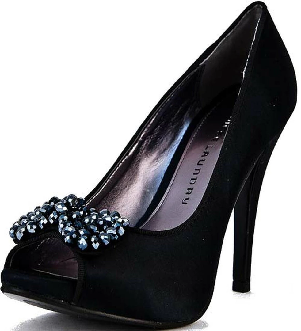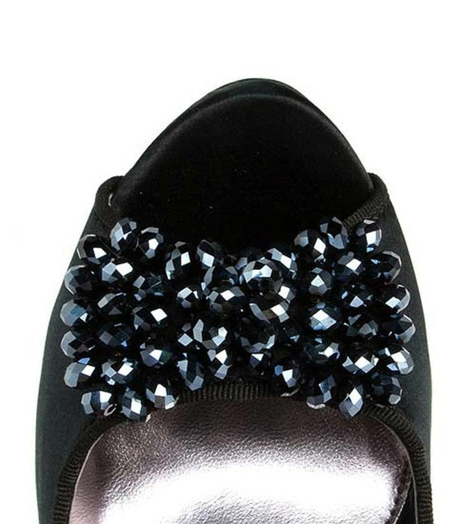4 ½” High Heel Peep-toe Pump Wrapped in Silver Satin featuring Front Bow Encrusted with Faceted Beads.Â