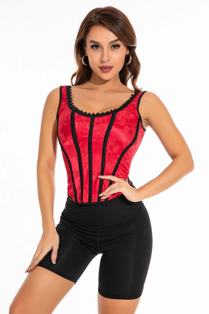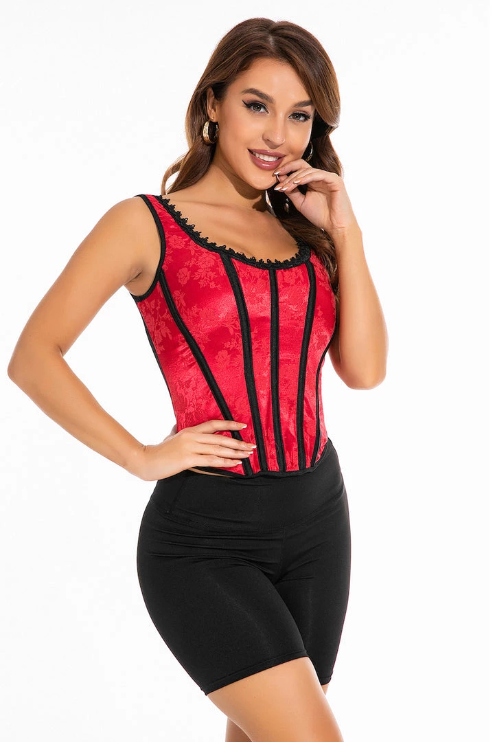 This brocade corset features a tank-style silhouette, contrast trim, boning, and a lace-up back.