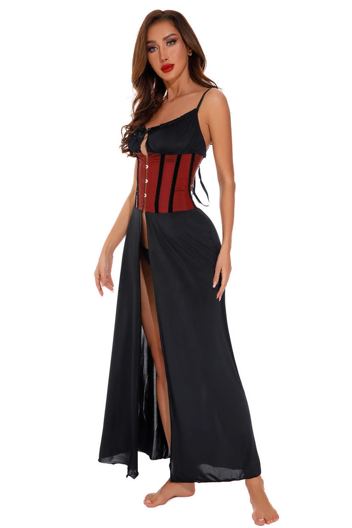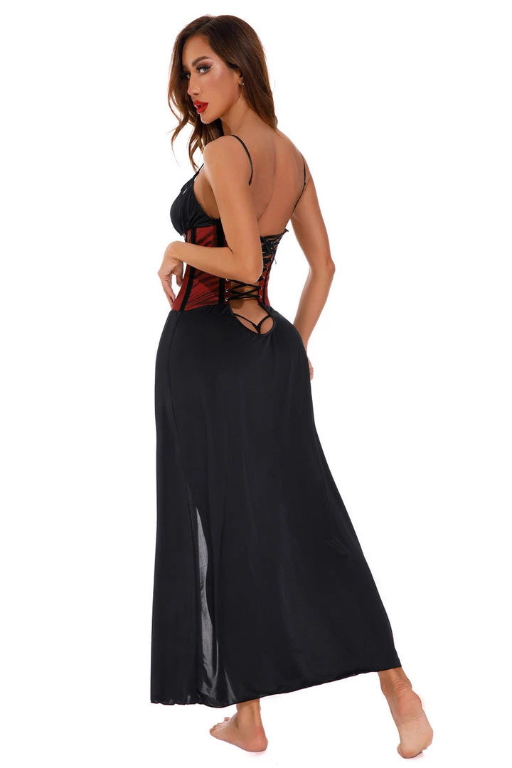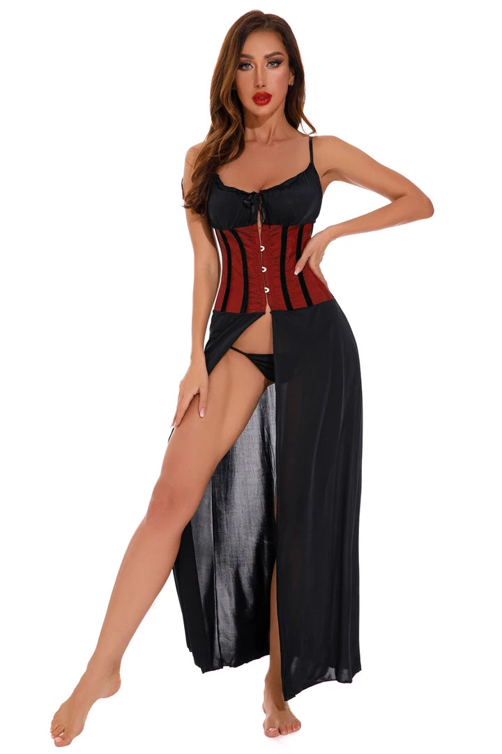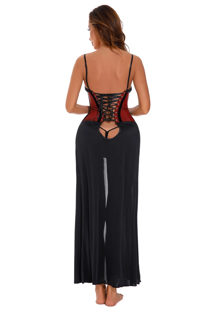 This satin lingerie gown has a burgundy corseted midsection with busk front closure.