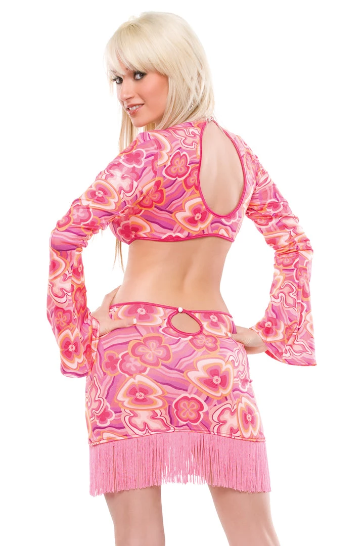 This Go Go Girl costume includes a retro print mini dress with a keyhole cut out, O-ring detail, halter neck, and a high/low hemline. (Stockings and headband not included.)