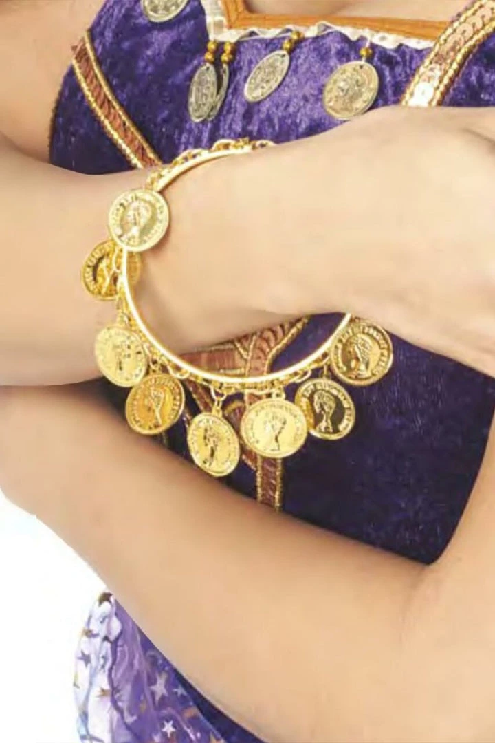 Add this gypsy coin bracelet to your gypsy, belly dancer, or genie costume to finish off the look you are trying to create. The bracelet simply slips on over your hand to allow you to easily take it on and off as needed. The dangling coins are imprinted with designs to create an authentic look. The golden color of the bracelet allows it to pair well with any costume.