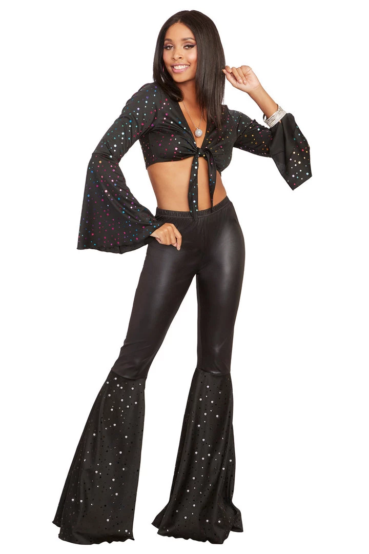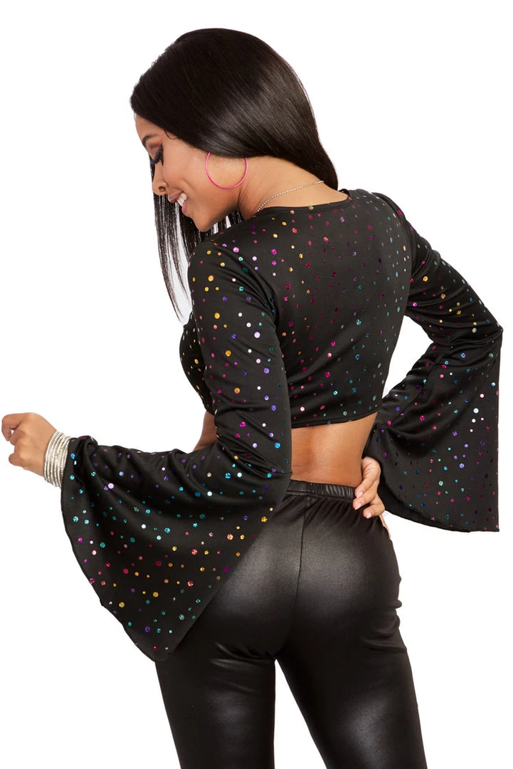 This black disco crop top features long, bell cut sleeves, a tie front and multicolor sequins.