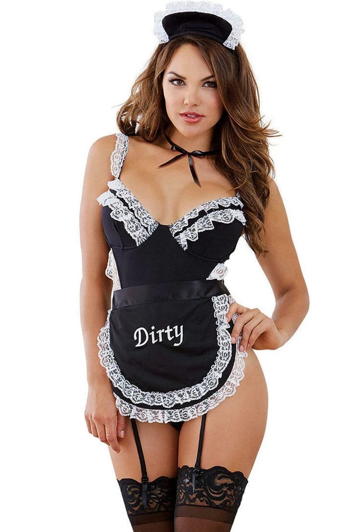 This French Maid Fantasy lingerie costume includes a black teddy with ruffled white trim, apron with “Dirty” print, attached garter straps, an open crotch, maid cap and a ribbon neck choker. (Stockings not included.)