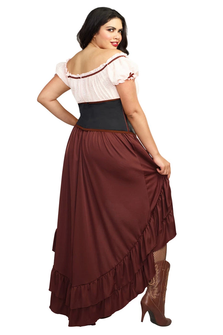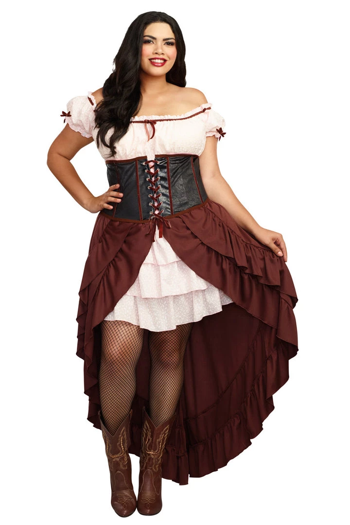 Pour a pint in this Plus Size Saloon Gal costume featuring a pale pink ruffle dress with off the shoulder sleeves, and a waist cincher with an attached overskirt.