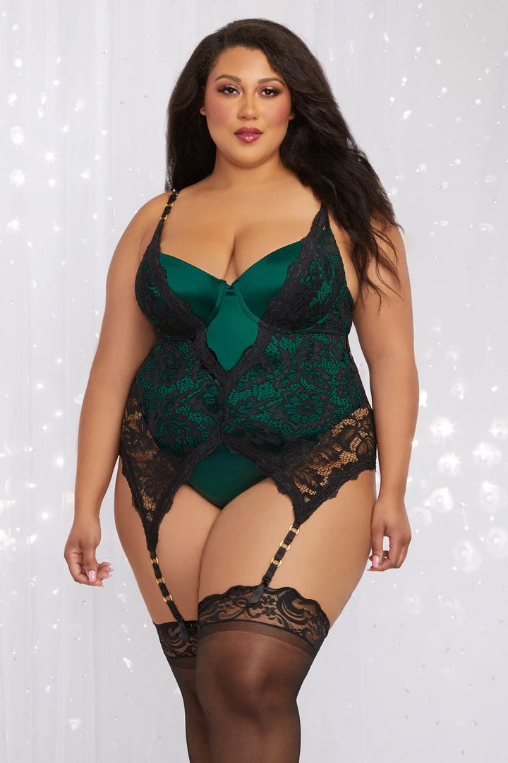 This plus size, eye-catching, emerald green teddy features a delicate black eyelash lace overlay, gold O-ring details, adjustable straps, underwire cups, and a thong back. (Stockings not included.)