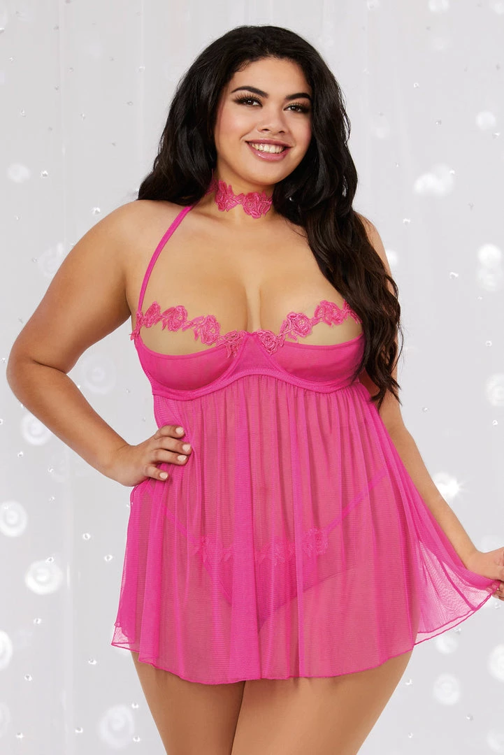 Keep them guessing in this plus size mesh babydoll with open cups, built-in underwire, black embroidery details, a halter neck, tie back closure, a Venice lace choker and an open crotch thong.