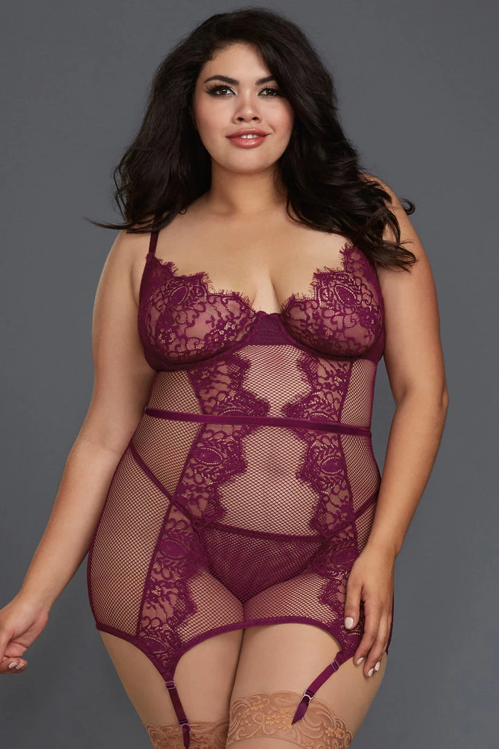 This romantic purple chemise set features fishnet and eyelash lace details, underwire lace cups, a hook and eye back, adjustable straps, adjustable garter straps and a matching g-string. (Stockings not included.)