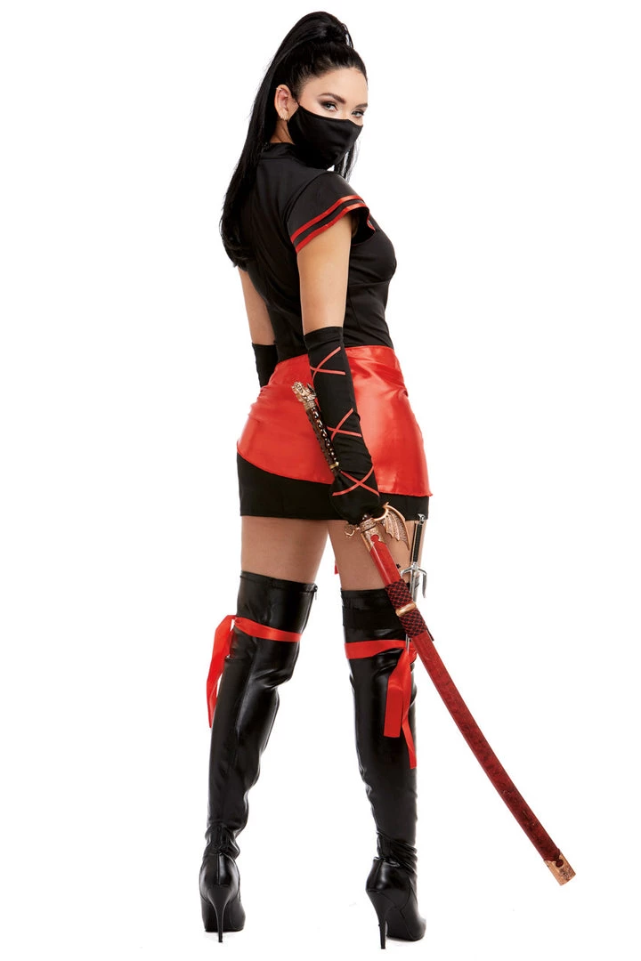 This Women’s Ninja costume includes a black dress, matching belt, fingerless gloves, a leg garter, leg ties, a faux sai dagger and a matching face mask.