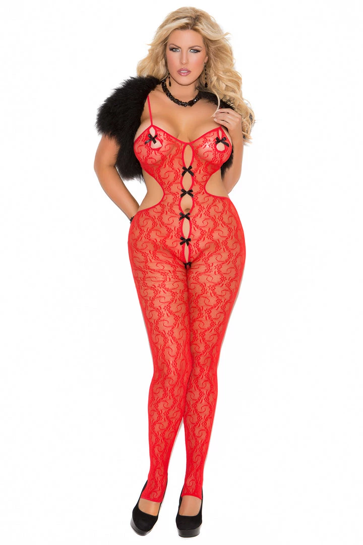 This plus size, red lace bodystocking features satin bow details and an open crotch.