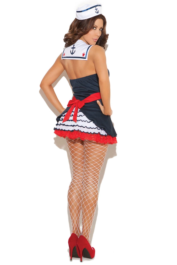 This Sailor’s Delight costume includes a navy blue mini dress with attached sailor collar, ruffle back, red belted tie back, and matching hat. (Stockings not included.)