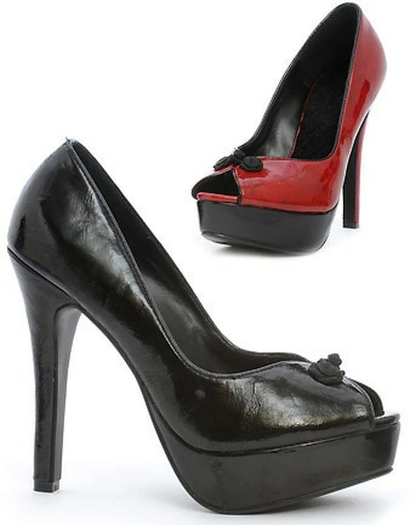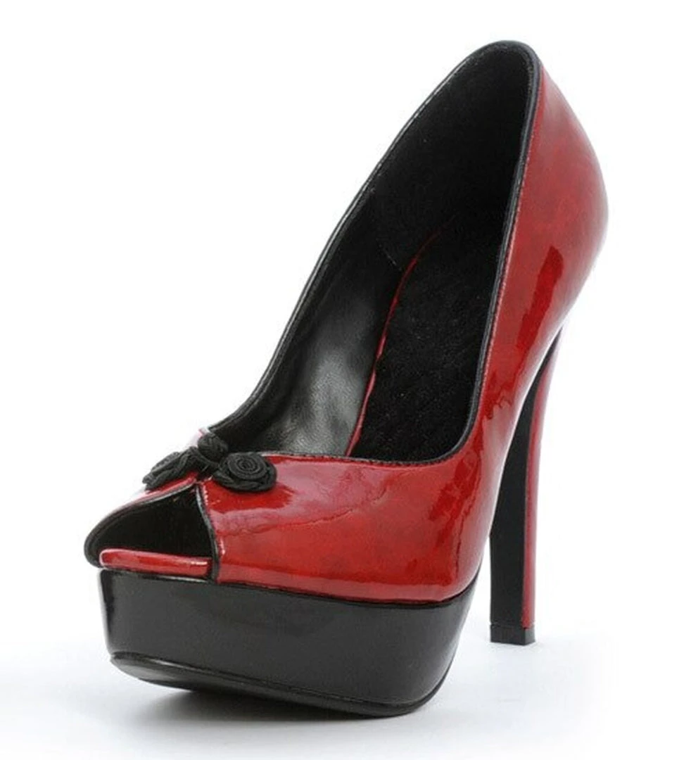 High Heel Shoes with 6″ Stiletto and 2″ Platform. Features Chinese Frog Button Detail and Peeptoe.