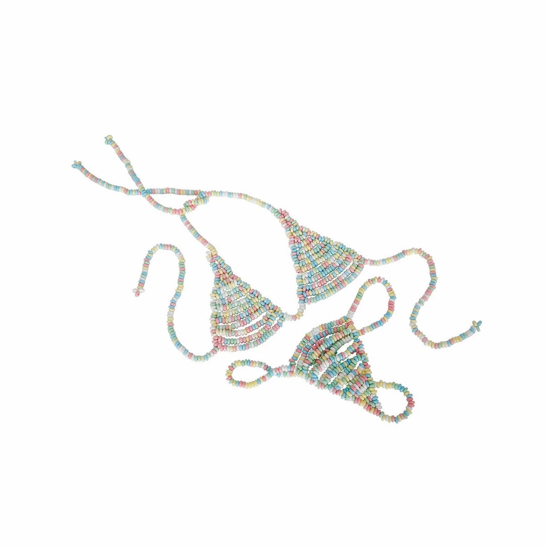 Equal parts sexy, fashionable, and delectable, this fun wearable treat is the ultimate in edible undergarments for the boudoir. Each stretchable item has traditional “candy necklace” beads with elastic strung throughout to create a one size fits most garment or accessory.