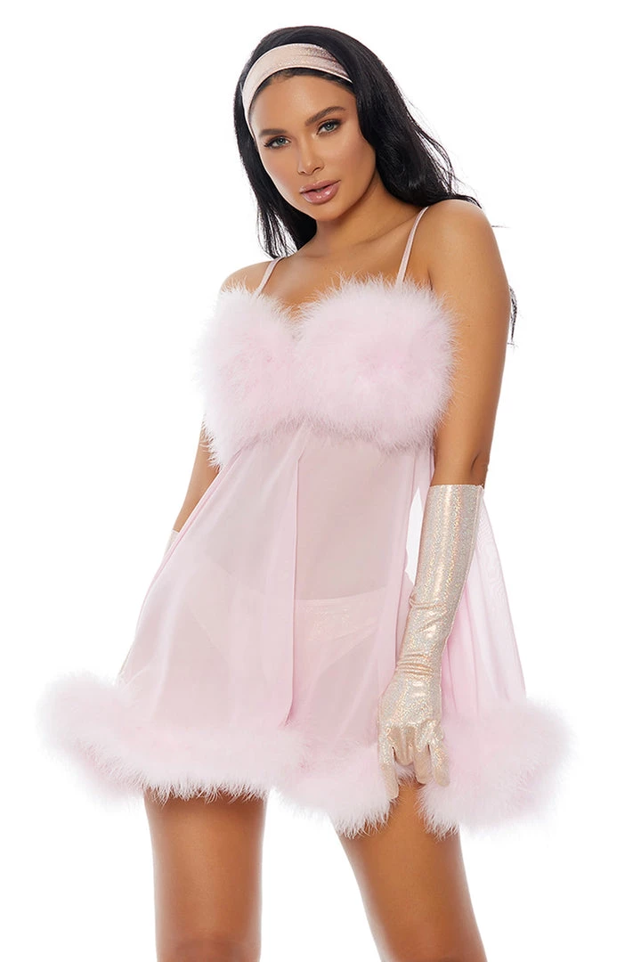 This four-piece, Femme for Real Movie costume incldues a sheer pink babydoll dress with pink marabou cups, pink marabou hemline, pink shimmer vinyl gloves, panty, and headband.