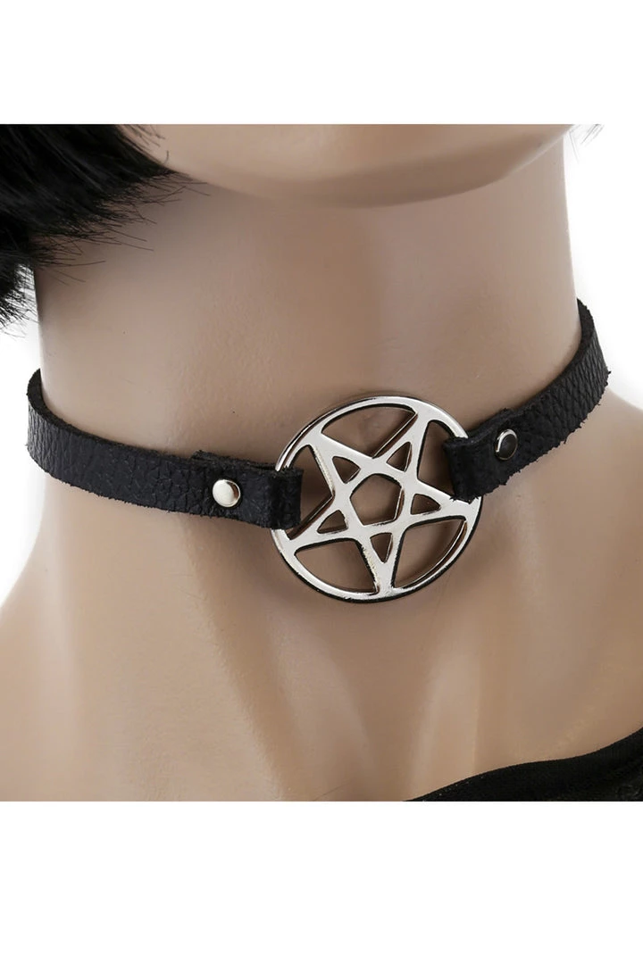 Cast your spell with this witchy Pentagram Leather Choker that features a women’s choker with thin 1/4″ leather choker and large metal pentagram medallion.