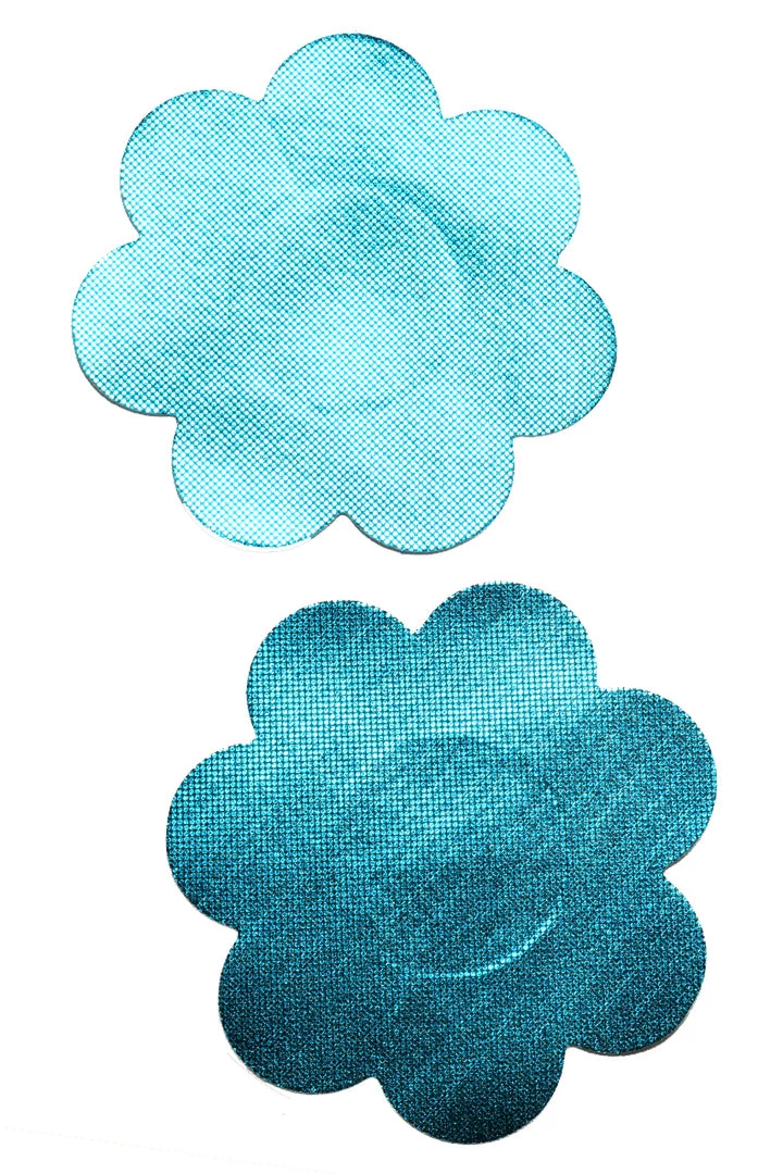 Metallic Blue petal nipple pasties. Feature self adhesive tape, just peel and stick on clean, dry, oil-free skin.