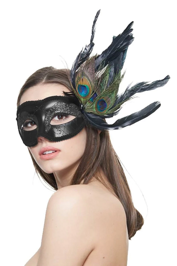Have a ball in this Dark Peacock Mask! Inspired by the opulence and elegance of classic Venetian masquerade balls, this mask is adorned with gorgeous, oversized peacock feathers, decorative rope trim and exquisite glitter swirls. Made from lightweight plastic and equipped with a soft tie back ribbon, the Dark Peacock Mask blends comfort with style.