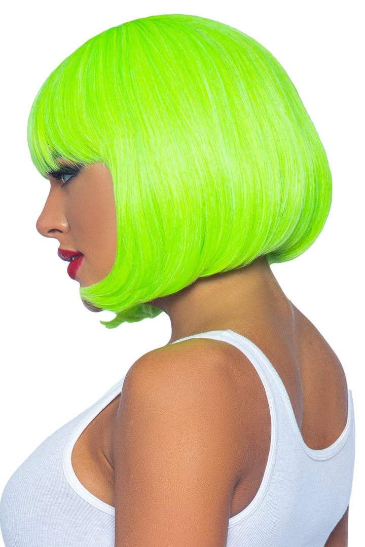 This 12″ neon green bobbed wig is the perfect accessory to your next Halloween costume.