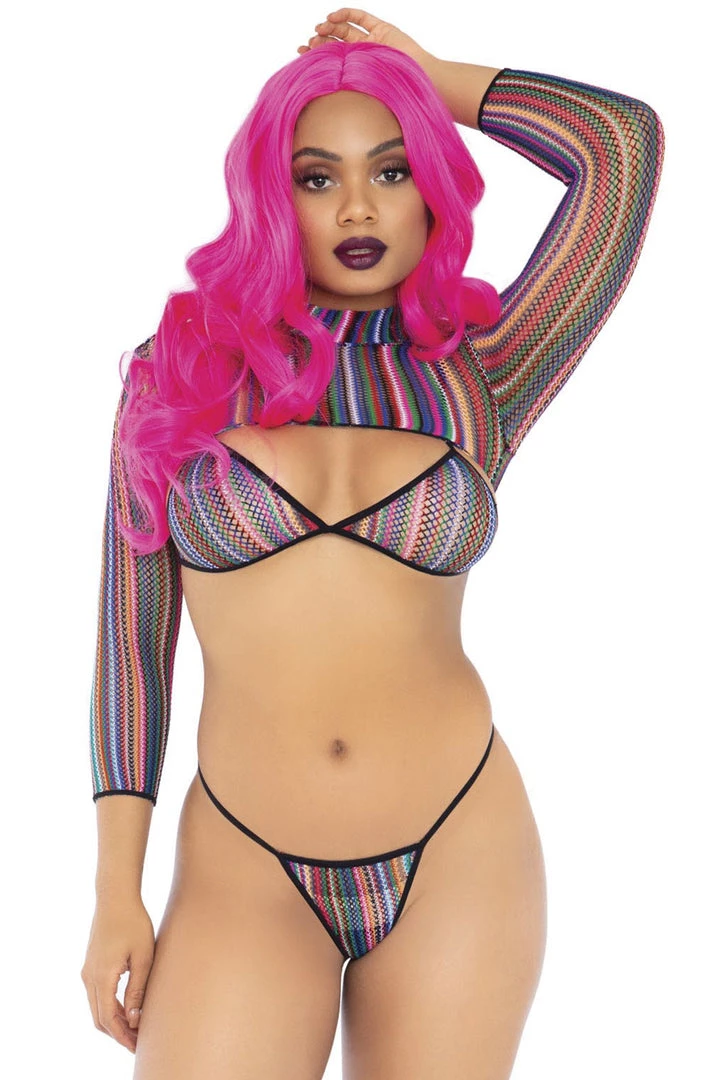 This three-piece set includes a colorful fishnet crop top with long sleeves, a triangle bikini top and matching thong.