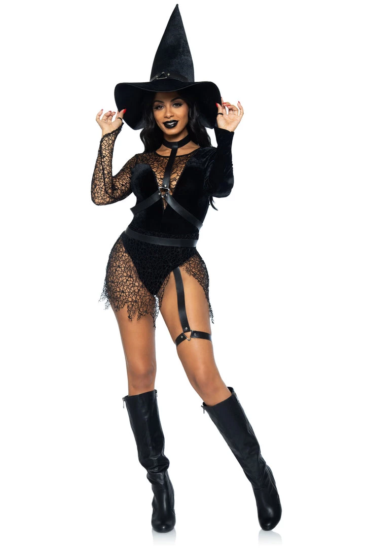 This three-piece, Crafty Witch costume includes a black velvet bodysuit with a snap crotch, distressed net details, an attached garter, a choker body harness, and a matching velvet witch hat.