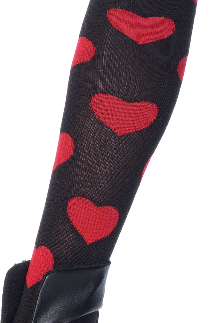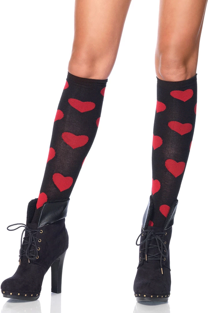 These black knee high socks feature red heart print details.