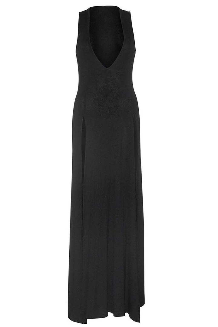 This long, Jersey knit lingerie gown features a deep-V, dual slit front and a low scooped bust.