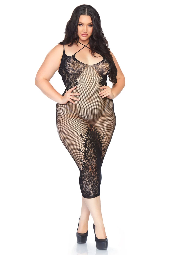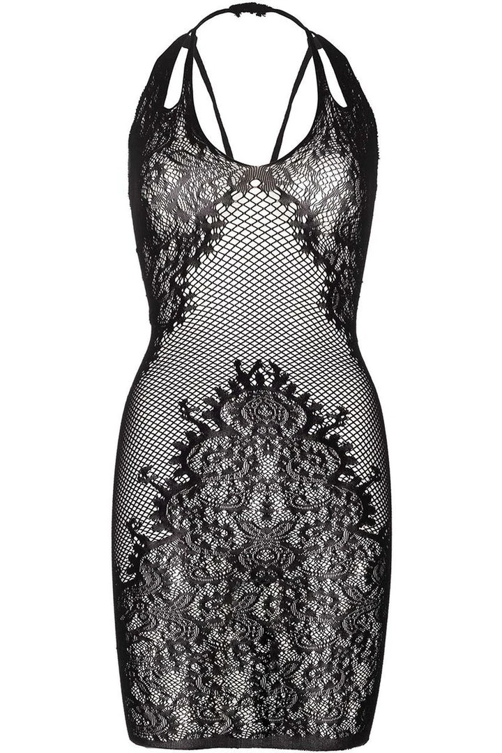 This black, seamless net and lace chemise features dual straps and a faux lace up back.