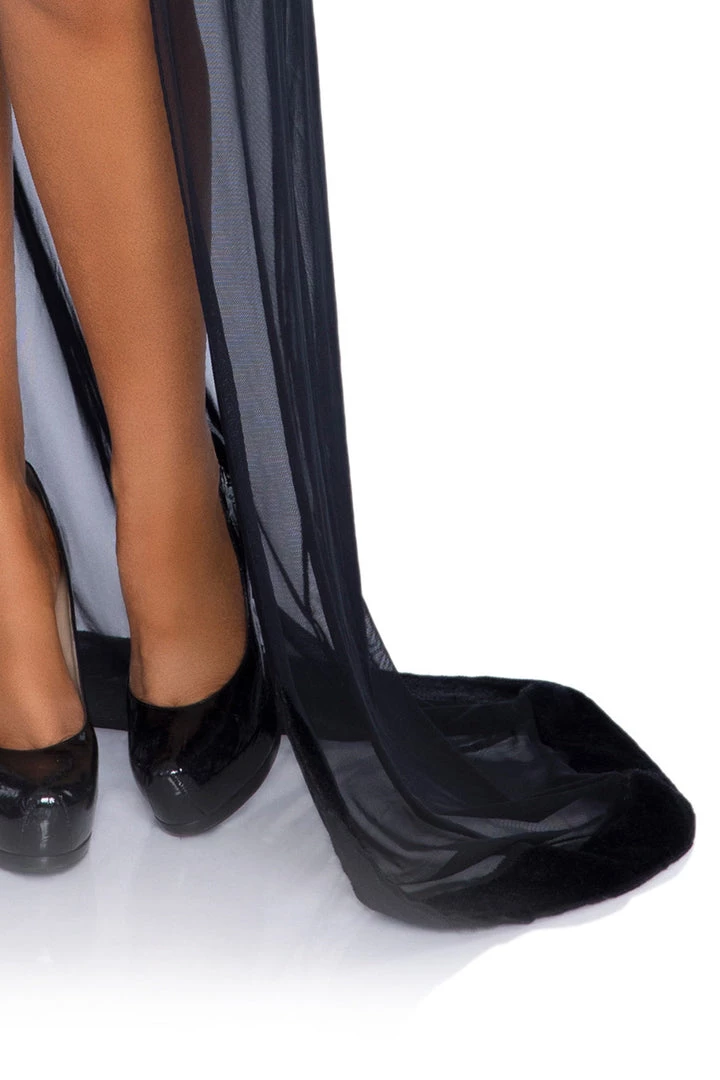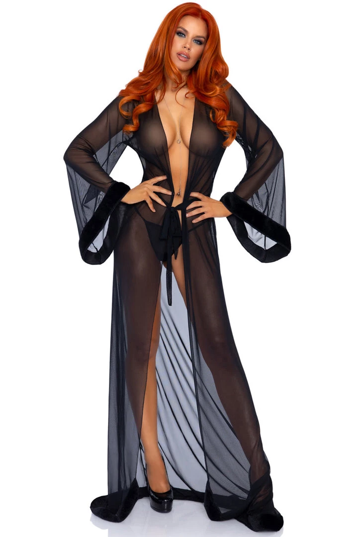 Complete your lingerie look with this long mesh robe with faux fur trim, tie closure and matching thong.