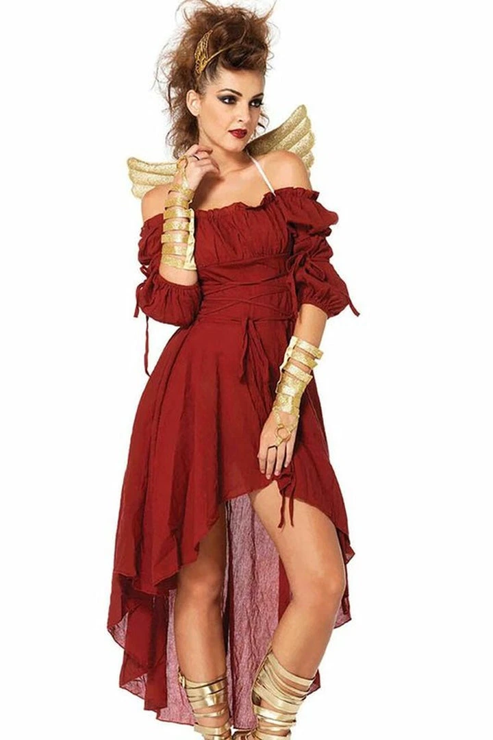 You’ll never be boring when you become a sexy peasant girl in this pretty and popular gauze peasant dress. This versatile dress is perfect for any occasion, whether it’s a costume party, a day at the beach, or wearing around town. This stunning hi-low dress features a low shoulder design with tie-up waist and sleeves to put you at the center of every medieval fairytale.