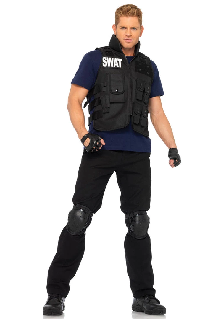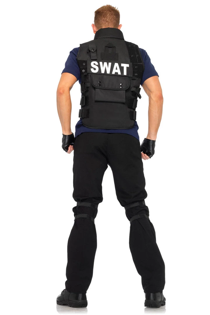 This four-piece, Men’s SWAT costume includes a black utility vest with SWAT print, a shirt, knee pads and fingerless gloves. (Pants not included.)