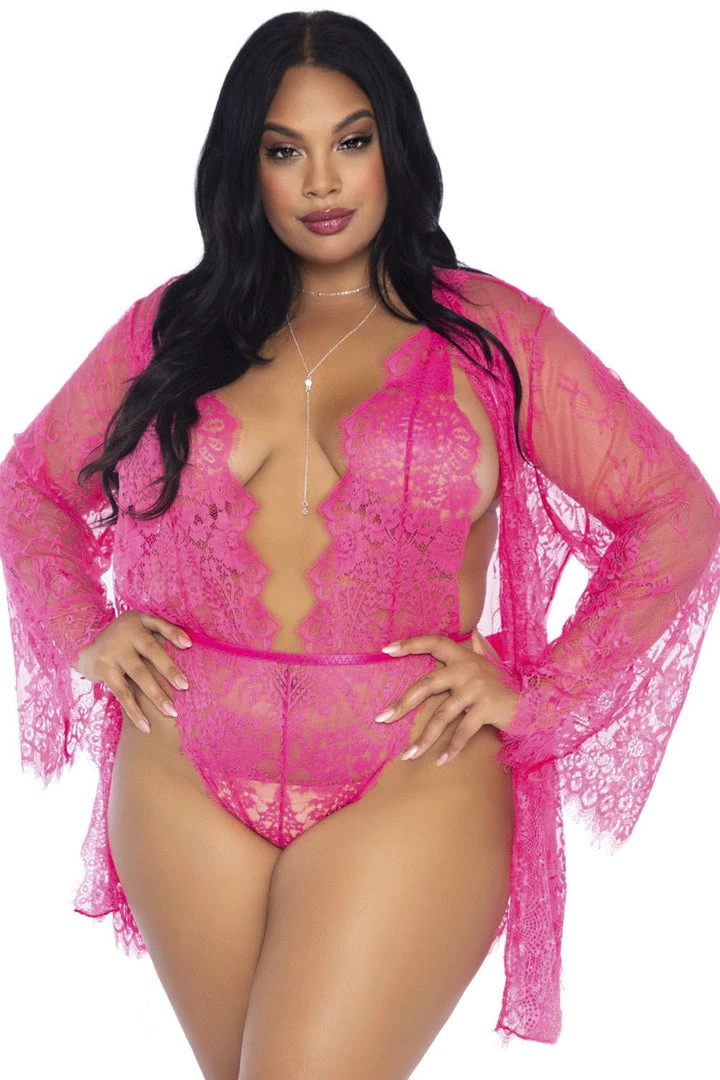 This three-piece plus size set includes a floral lace teddy, matching robe and a satin tie closure.