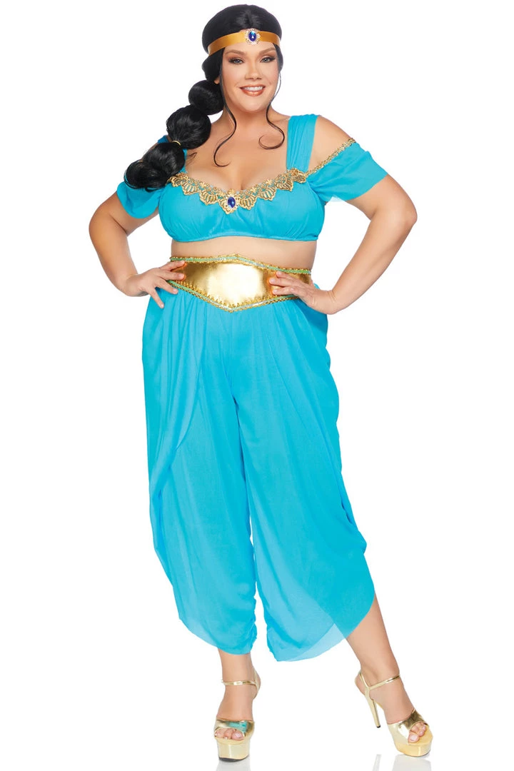 This plus size Sexy Desert Princess costume includes a blue crop top with cold shoulder cut outs, gold trim and jewel accents, layered high waisted harem pants with built-in boy shorts and a matching jewel headpiece.