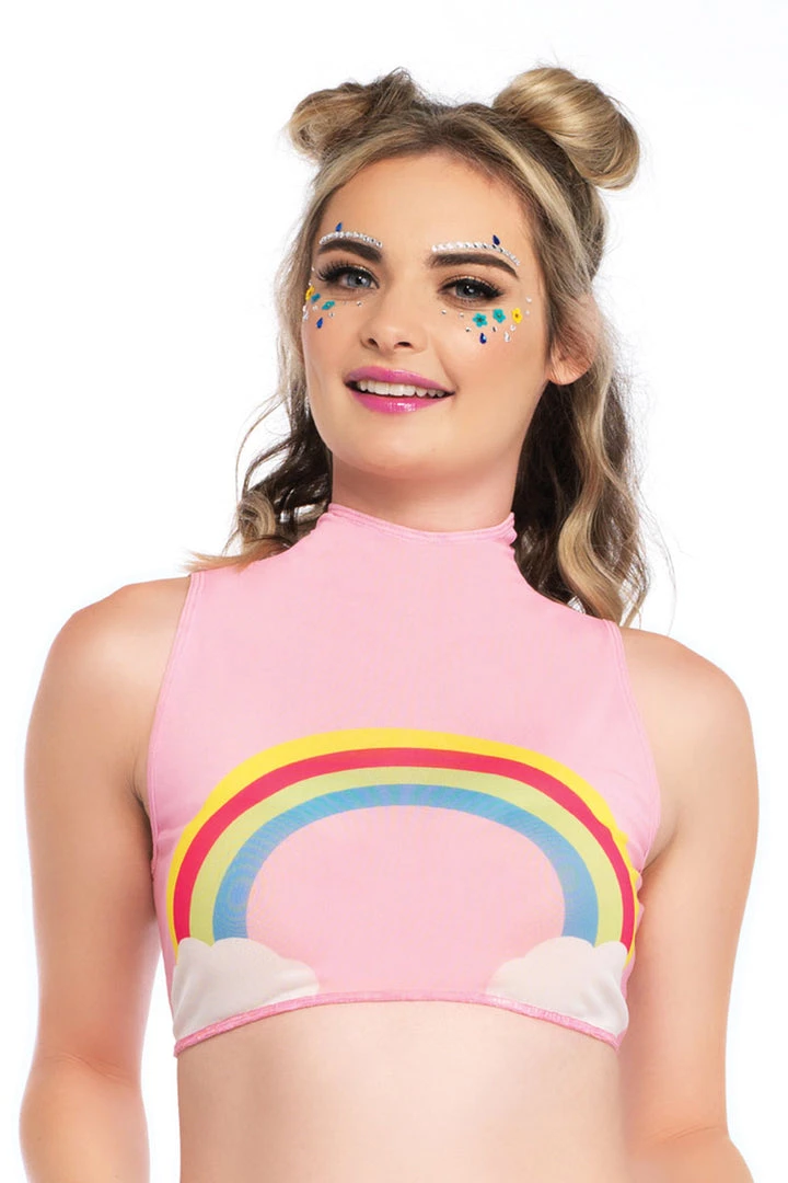 This pale pink mesh crop top features a rainbow print, high-cut neck, and a zip-up back. (Top only.)