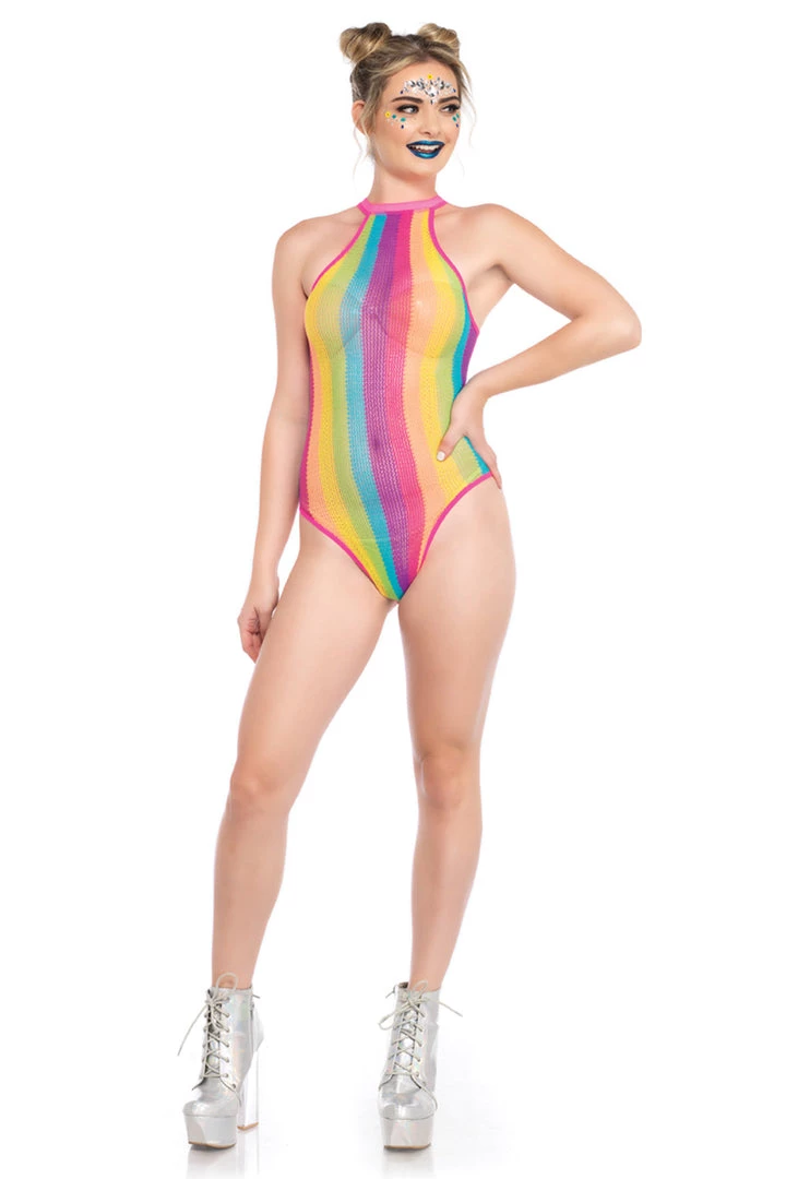 This rainbow striped bodysuit features a high cut neckline and a cheeky cut back.