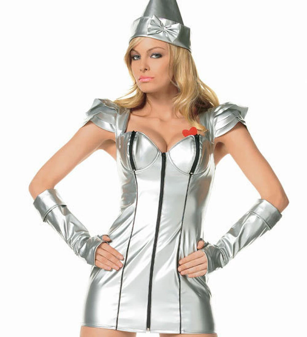 Ever thought of heading off to Oz to see the Wizard with Dorothy? Well, if this is your wish, then the Tin Girl Halloween Costume is the perfect choice for you. This costume is a complete three piece set. It include elbow-lenght metallic silver Arm Warmers, a sassy pointed Vinyl Hat is metallic silver, and of course a Zipper Front Dress with a Red Heart detail. The dress is a mini dress in metallic silver with black piping and accents. This sassy costume allows you to play the Tin Man and the vixen all at once this Halloween.