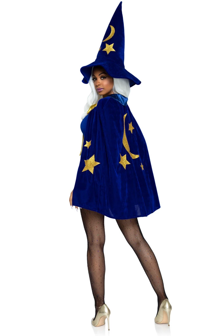This two-piece, velvet wizard kit includes a blue velvet cape with yellow moon and stars print, a yellow satin tie closure, and matching oversized wizard hat.