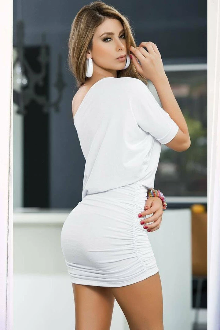 Simply sexy! This classic little mini dress is the perfect wardrobe staple featuring an off-the-shoulder silhouette with short sleeves, billowing bodice and multi-shirred, side-seamed fitted skirt with flattering straight hemline.